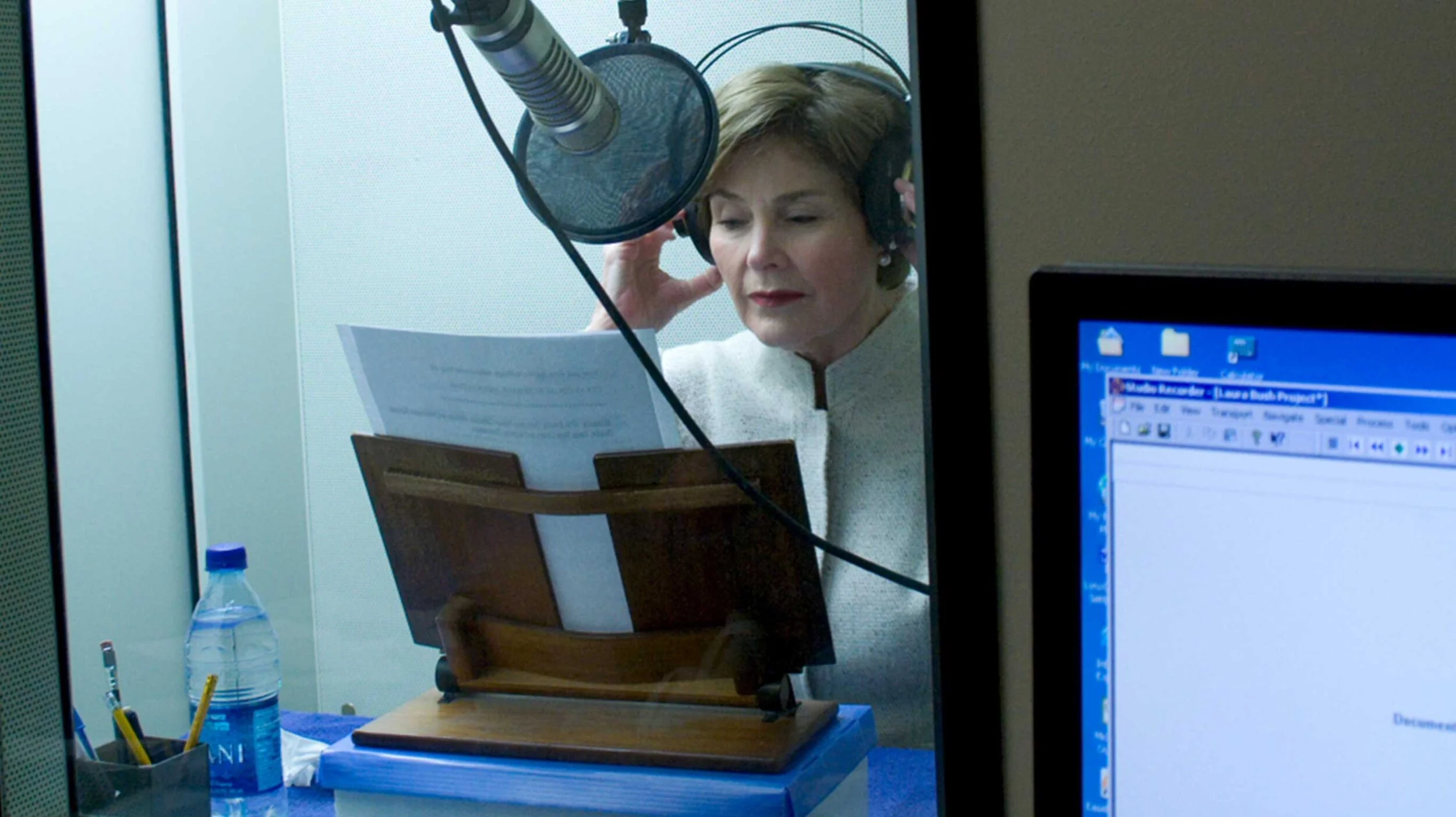 First lady Laura Bush in the Talking Book Program recording studio reading a document from the State Archives.